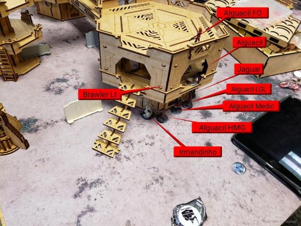Emily and the Alguaciles were on my left deployment zone, split across levels and buildings. Behind them was the Irmandinho and his Zondbot. On my left I had the Brawler on a roof covering a good chunk of the table. My bots were in cover on the right side with the Jaguar babysitting the Xenotech. I do replied my reserve, Uhahu, on the left behind a billboard. I can’t find where I had the two Bandits, they were up in the mud field, covering the left and right antennas.