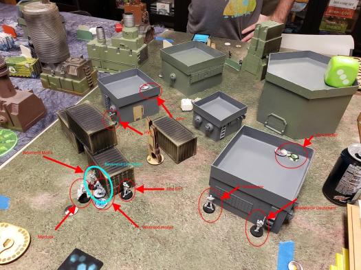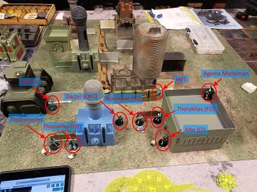Here we had a bit rules fumble, one of the remaining Camo markers was a Caliban with Chain of Command, so we played this turn as loss of lieutenant. So, in loss of lieutenant DoodleKing didn’t have enough points to get to the AC2, so he focused on maximizing points. He managed to take out my Taskmaster before ending his turn. With both AC2s undamaged and a classified each it came down to who had more things from the panoplies. With the two things I got them I got that point, making it a:
