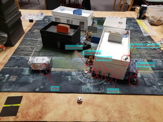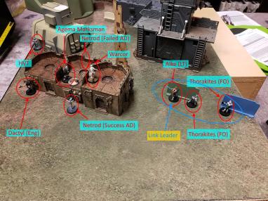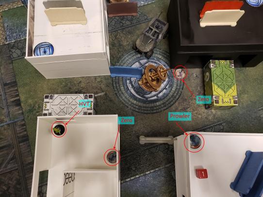 I start by attempting to have the last Morlock make it forward to the AC2, but it goes down to a combination of a mine and shock marksman rifle. The shock was unfortunate as this Morlock rolled V: Dogged for its metachemistry. The Taskmaster didn’t have enough orders to make it to the AC2, so I had my Zero come out to surprise shot down the Mentor Lt.