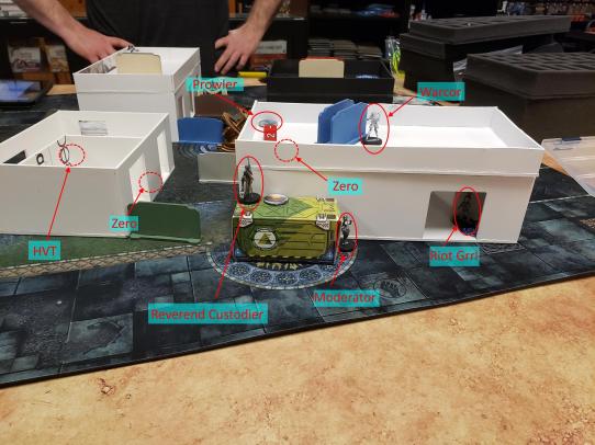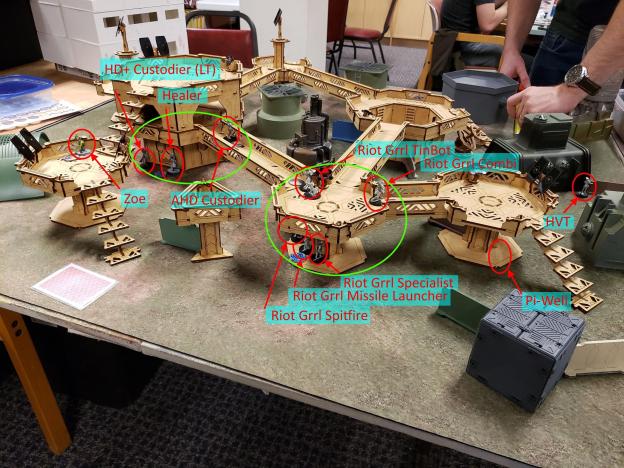 The first thing I did was over infiltrate Bran to threaten the AC2. My Reverend Haris was on the middle level with the Custodier prime behind cover. Kusanagi was set up to start attacking right away. My Morlocks were on the left right and middle. My zero minelayers were set up to cover the AC2 approach. The lunokhod was up high with the koalas covering the AC2 as well. My moderator was up on level 3 prone. Finally, my taskmaster was my reserve and covered my left flank.